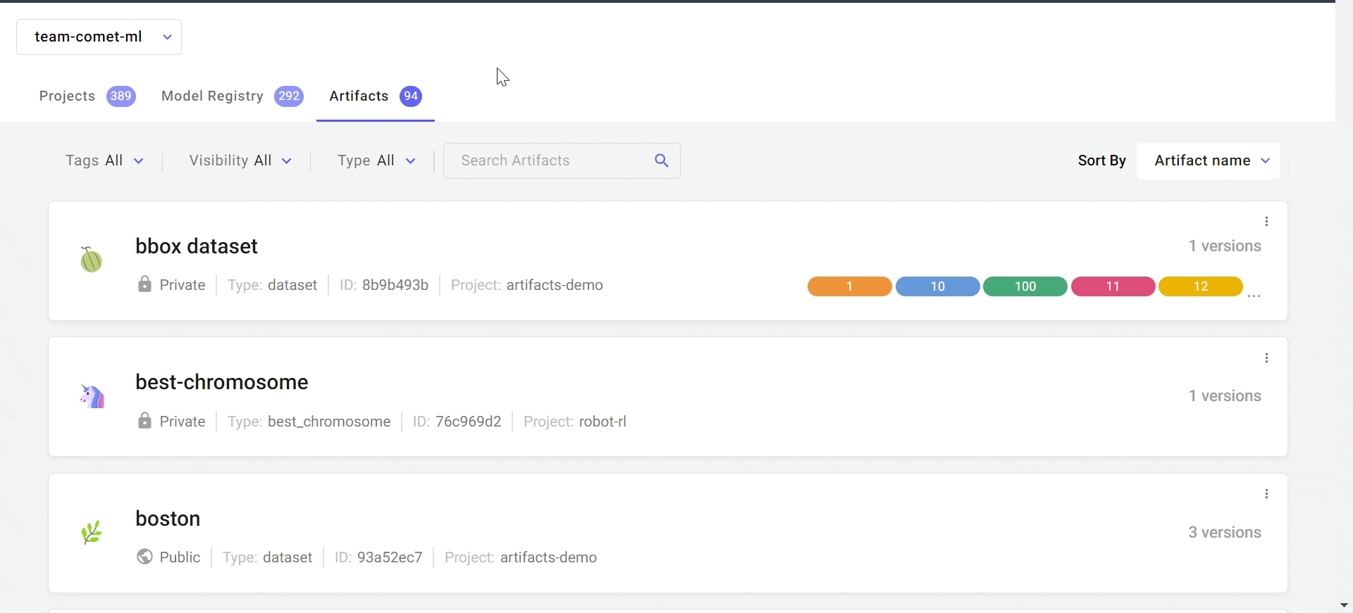 Comet Artifact Lineage provides an interactive way for you and your team to explore and compare datasets so you can better understand and visualize the datasets that you are using for machine learning.