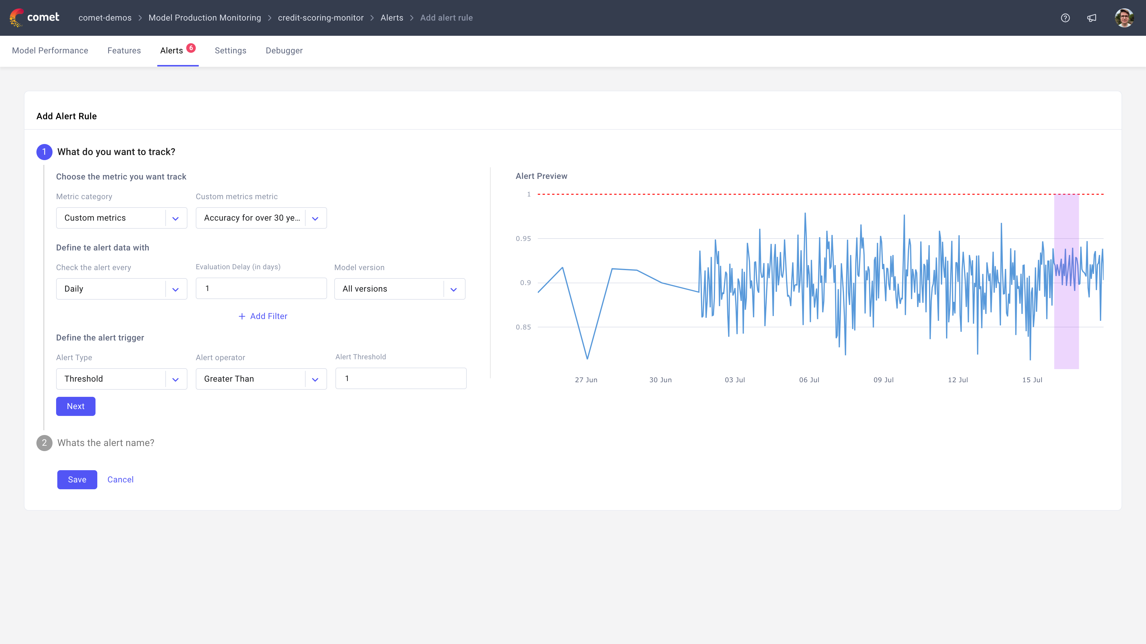 To create a new alert, click on the + Add Alert Rule button which will open a new page where you can define the alert rule. From there, you will be able to create an alert on any of metrics tracked in Comet including custom metrics. You can also customize the alerts further by defining a filter so only a subset of your data is used to compute the alert. When the alert is fully configured, simply click Save.